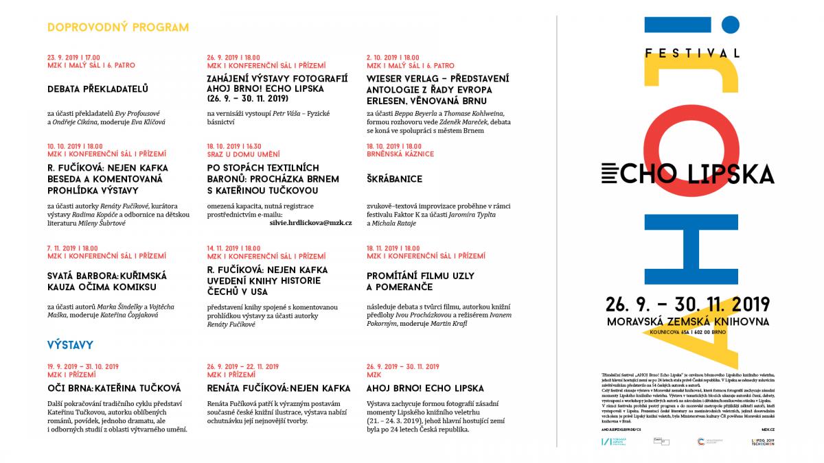 Srdcem festivalu je výstava „AHOJ Brno! Echo Lipska“, která zachycuje formou fotografií na třech patrech knihovny zásadní momenty Lipského knižního veletrhu konaného ve dnech 21. až 24. března 2019, jehož hlavní hostující zemí byla po 24 letech Česká republika. Její vernisáž se uskuteční ve čtvrtek 26. září za přítomnosti jednoho z autorů, který se prezentoval v Lipsku, Petra Váši a ředitele Moravské zemské knihovny prof. Tomáše Kubíčka i koordinátora projektu Martina Krafla.